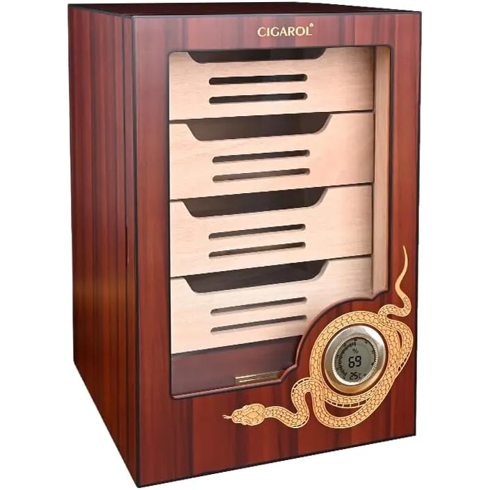 Desktop Cigar Humidor Cabinet with Triple-Sided Light, Digital Hygrometer, Humidifier and Humidity Packs. 4 Cedar Wood Drawers, Holds 200 Cigars