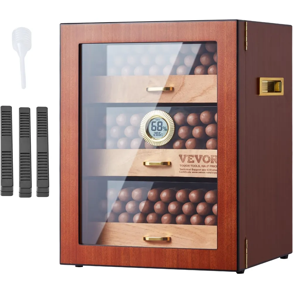 VEVOR Cigar Humidor Cabinet, Handmade Spanish Cedar Wood Cigar Humidor for 100-150 Cigars, Glass Cigar Desktop Storage Case with Digital Humidifier, Hygrometer, Shelves, and Handle, Great Gift for Men