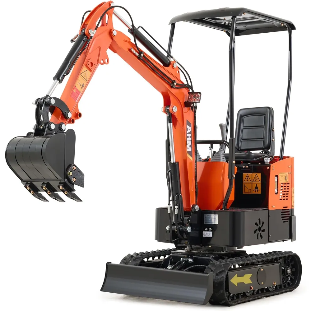 AHM Mini Excavator, 1 Ton Mini Digger with Hammer Auger Log Grapple Quick Hitch Grading Bucket & Rake Included, 13.5 hp Small Crawler Machine with Rain Canopy for Home Garden Farm Park Roadway Digging