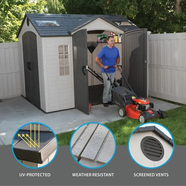 8 feet. Width x 10 feet. D plastic traditional storage shed