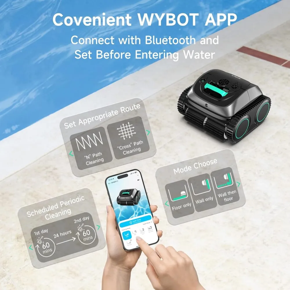 - Powerful Suction & Deep Cleaning: Equipped with an upgraded independent water pump motor, WYBOT C1 pool vacuum delivers 2X stronger suction to lift debris, sand, leaves, and algae. Dual PVC brushes grip surfaces tightly, working on tile/mosaic/glass. Smartly avoids stuck scenarios for uninterrupted cleaning