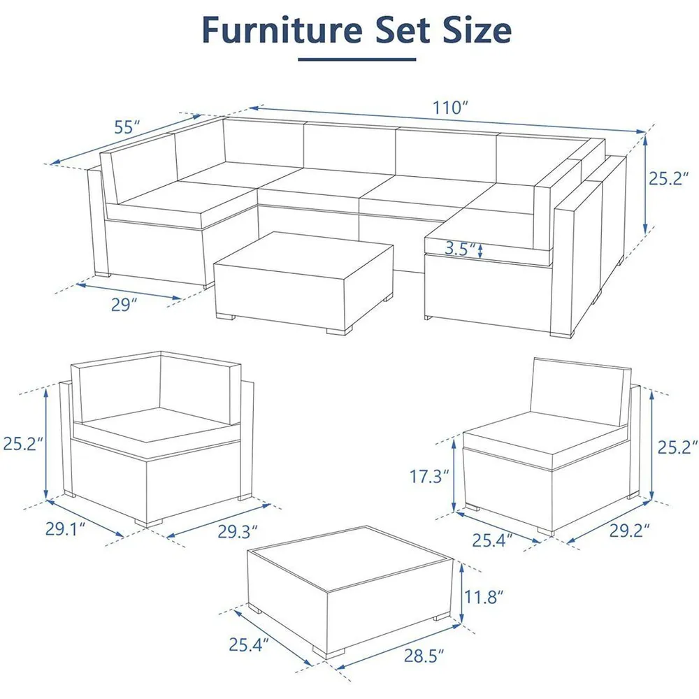 Packing Included(7 Pieces set).4 x Single armless chairs. 2 x Corner armchairs.1 x Coffee table with tempered glass top and 6 x seat&back cushions. Our 7 piece sectional wicker sofa set will arrive in multiple boxes with all necessary hardware and detailed instructions. Normally this sectional patio furniture set required 40-60 minutes to assembly by one person. What’s more. this outdoor furniture set have endless number of configurations. you can match and purchase freely as you need.