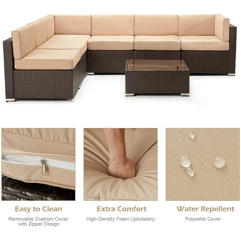 Beautiful Wicker Style.This patio furniture set features brown PE rattan with khaki cushions. which is perfect addition to your patio. garden. backyard. pool. other indoor and outdoor space.This modern outdoor sectional sofa comes with enough room to seat 4-6 friends comfortably with a table to hold food and drinks. 17.3″ seating height make the chair more comfortable.