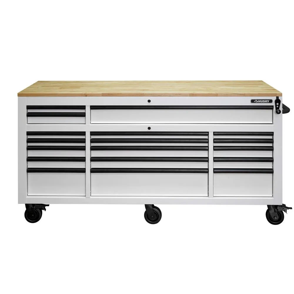 Raise your work to a whole new level with the innovative Husky 72 in. 18-Drawer Mobile Workbench with Adjustable-Height Top. The workbench has a revolutionary feature that allows you to adjust the height of the solid wood work surface according to your needs. A removable crank handle raises and lowers the top anywhere between 38 in. to 48 in. above the floor. This innovative design allows a better ergonomic standing position, which is known to help reduce strain on your body and joints. This rolling tool cabinet has heavier 19-Gauge steel. This workbench is 24 in. D, which is 6 in. deeper than most standard rolling tool cabinets, providing more usable storage space that is strong enough to support 3,000 lbs. and has 33,545 cu. in. capacity. The 1 in. thick, solid wood top is coated with polyurethane for added utility and durability. Charge your power tools with the built-in, 6-outlet, 2 USB power center. The 120 lbs. rated, soft-close drawer slides keep the drawers from accidentally opening or from slamming shut. Drawer liners are included to protect and keep your tools in place. The top long-drawer and 3 bottom drawers are equipped, with double 120 lbs. soft closing drawer slides for increased weight capacity up to 240 lbs. For added security, this unit is fitted with a barrel key and lock system. This mobile work center has 6 large, 5 in. x 2 in. all swivel casters and a steel tubular side handle, which allow you to easily move around, even when fully loaded.
