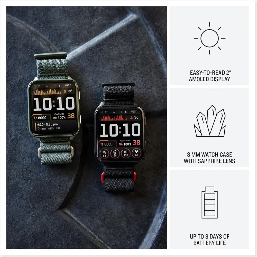 • Sleek GPS smartwatch with our biggest display — 2” easy-to-read AMOLED — and our thinnest watch case measuring 8 mm with a scratch-resistant sapphire lens, titanium caseback, bright LED flashlight and ComfortFit nylon band for all-day wearability