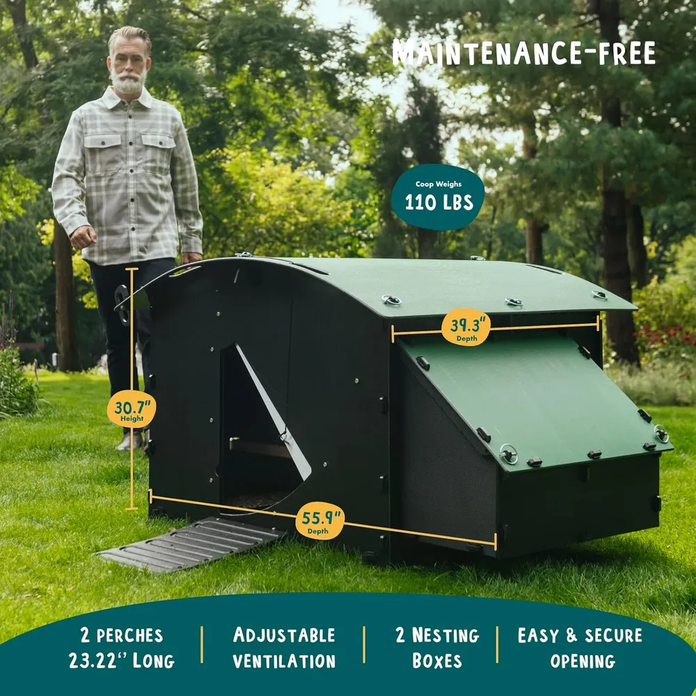 • EINFACH ZU REINIGEN UND ZU BEWEGEN – Dank der glatten Oberflächen im Inneren lässt sich der Nestera Hühnerstall schnell reinigen. Hartnäckiger Schmutz oder Kot kann leicht mit einer Bürste entfernt werden. Das Design ermöglicht es, den Stall in wenigen Minuten zu demontieren und für eine gründliche Reinigung wieder zusammenzusetzen. Im Gegensatz zu Holz trocknen die Nestera Ställe schnell. Dies kann im Winter einen großen Unterschied ausmachen, wenn Holz mehrere Stunden zum Trocknen braucht.