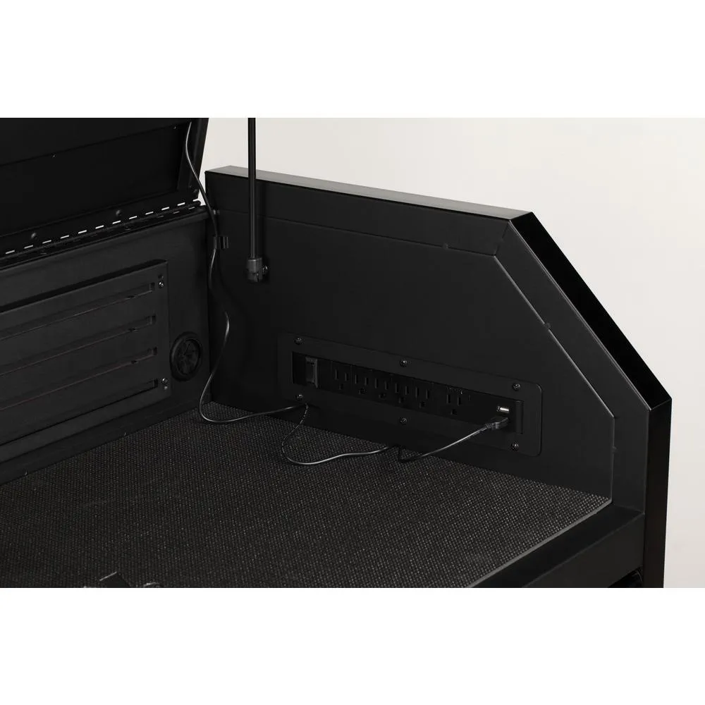 The latest generation of the Husky Industrial 52 in. W x 21.5 D 15-Drawer Tool Chest and Cabinet Combo has arrived. This combo adds some exciting new features to an already popular design. 1 of new features in this combo is the pull-out wooden work surface in the lower right-hand drawer of the chest. This drawer will lock into place when fully-extended to create a work station or place to put a laptop. The wood top is also hinged so you can lift it up to store your tools and supplies. Another new feature is the addition of a 550 Lumens LED light bar integrated into the chest lid, which will provide additional lighting to your workspace. Constructed of high-grade, all-welded 18-Gauge steel construction and finished with tough, industrial textured black powder-coat paint, this unit is built to last. Drawers are all full-extension and glide on ball bearing slides that can support up to 120 lbs. These slides also have a soft-close retention system that pulls drawers completely closed and ensures they are secured. The reinforced top lid is supported by gas struts, which make it easier to open and close, while the back of the top till has a large magnetic plate that provides storage and quick access to frequently used tools. Also inside the lid are 8 electrical outlets and 4 USB ports that allow you to securely charge tools and portable devices while unit is locked. An ergonomic handle and 6 in. x 2 in. casters allow you to easily move the cabinet around your workspace.