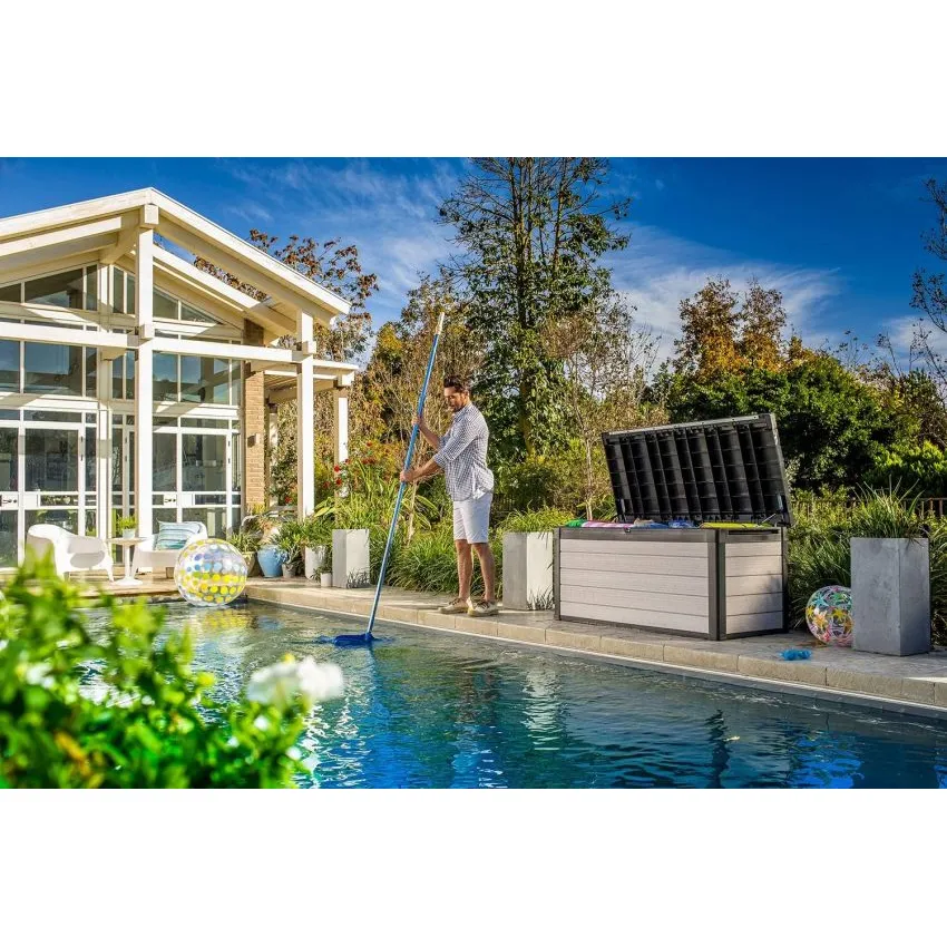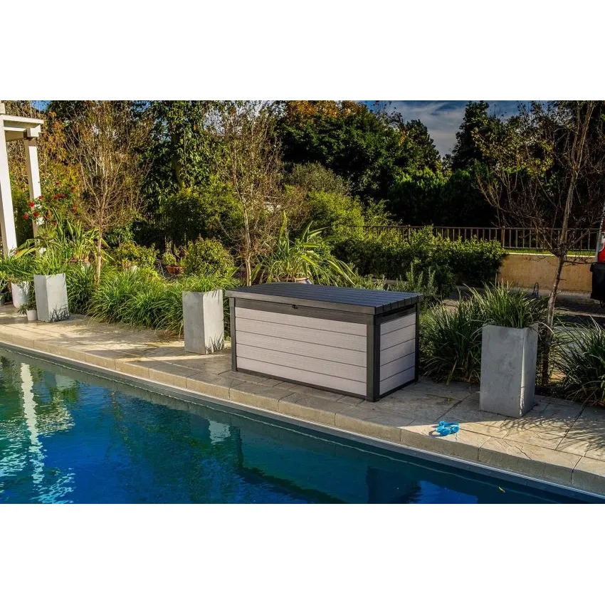 Keep pool toys, cushions, and more organized and out of the way with a handy deck box like this! Crafted from resin with a black and gray hue, this piece features a streamlined, slatted design with a flat top that easily doubles as a spare seat in your outdoor arrangement. Best of all, this piece is water-, leak-, and rot-resistant, so it keeps your items clean and dry whether it’s poolside or holding up when the weather worsens.