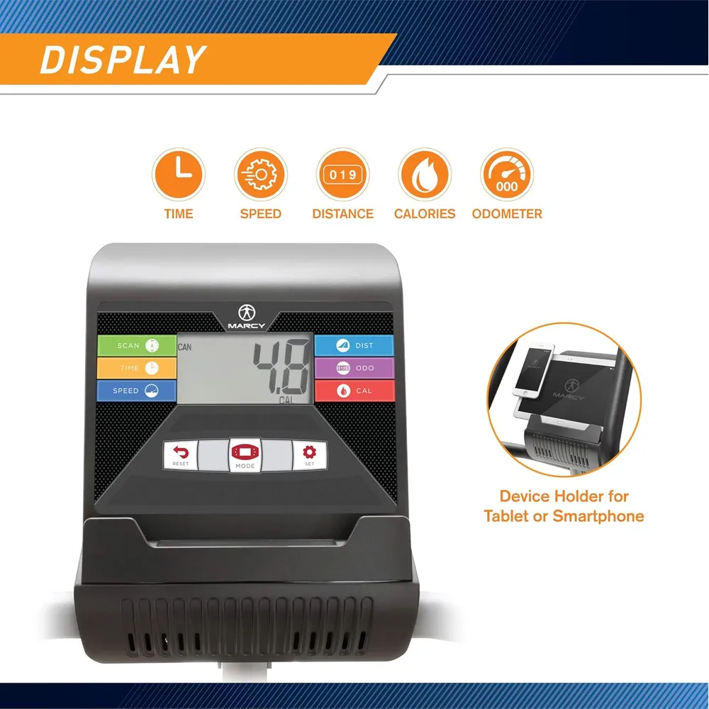 Looking for an easy and convenient way to lose unwanted pounds and increase cardiovascular endurance? The NS-40502R Marcy Recumbent Bike is the answer. Benefit from the same type of workout you would experience on larger and more expensive exercise bikes, but in a compact design. The eight levels of resistance are made to challenge you at every level in your fitness routine. With its foam covered ergonomic handles and adjustable foot pedal straps, you can workout comfortably and efficiently. The LCD computer screen displays time, speed, distance, calories, odometer, and scan-through of all 5 settings so you can keep track of your workout. This recumbent bike is designed with a step-through frame that makes getting on and off the bike much easier and the large padded seat means you can exercise more comfortably. Take your workout routine a notch above with this premium Marcy workout equipment!