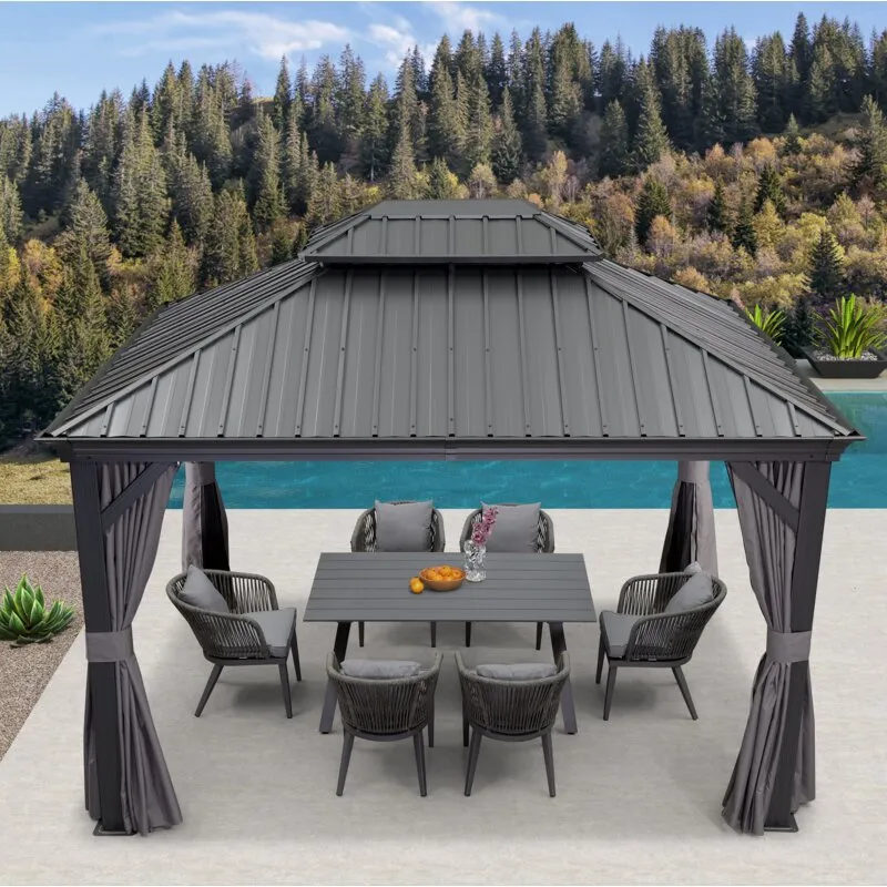 - Drainage system design:Reasonably sloped roof designed to allow water to drain quickly. and the water gutter design ensures rainwater flows out of the edges of the frame and poles.