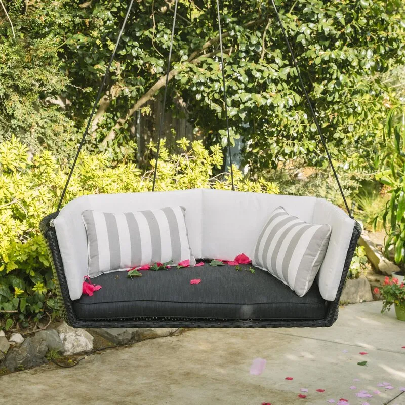 Sally loves hanging in the shade with a nice breeze and singing along to show tunes. This loveseat swing that goes both ways, is a show stopper with its rounded bottom, welcoming back and seat cushions, and open relationship status.